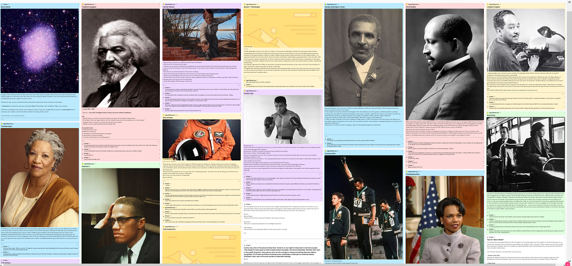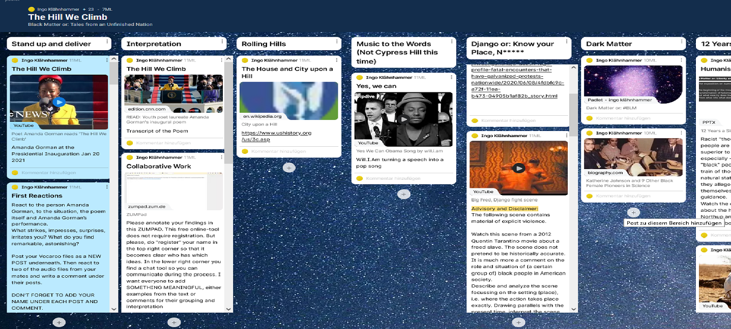 Grundkurs Klasse 11Dark Matter or: Black Lives Matter "Dark matter" ist der englische Begriff für "dunkle Materie", eine physikalische Größe. Diese macht die hälfte der Gesamtmasse des Universums aus, ist aber, wie der Name bereits sagt, unsichtbar. Dieses Konzept wurde hier metaphorisch auf die farbige Bevölkerung der USA angewendet. Bei diesem Projekt erforschten die Schülerinnen und Schüler des Grundkurses die Biographien maßgeblicher schwarzer Bürger der USA, stellten diese einander vor und reflektierten dann diese Erkenntnisse historisch, kulturell und politisch, insbesondere den Gegensat zwischen tatsächlicher Bedeutung für die Geschichte der USA und ihrer öffentlichen Wahrnehmung. Afropod or: The Hill We Climb Anlässlich des Black History Month, der jeden Februar in den USA begangen wird, und ausgehend vom Gedicht der jungen afroamerikanischen Dichterin Amanda Gorman, das sie zur Vereidigung des neuen Präsidenten der USA, Joe Biden, am 26.01.2021 vortrug, untersuchten die Schüler und Schülerinnen des Grundkurses Englisch Rassismus in den USA in historischer und gegenwärtiger Perspektive. Dazu analysierten wir u.a. Szenen aus den Filmen "Django Unchained" und "12 Years a Slave". Abschließend erarbeiteten die Schülerinnen und Schüler in Einzel- bzw. Partnerarbeit eine Episode zum fiktiven Podcast "Afropod". Hier stand es ihnen frei, auch Themen aus dem persönlichen Umfeld aufzugreifen. So wurden neben profunden Analysen des Alltagsrassismus im Polizei- und Justizwesen der USA u.a. auch sportpolitische Themen im deutschen Kontext behandelt und z.B. die Biographien deutscher Sportler wie Erwin Kostedde, des ersten dunkelhäutigen Fußballnationalspielers der Bundesrepublik, thematisiert. Für dieses komplexe Vorhaben bekamen die Schüler und Schülerinnen vielfältige methodische und technische Hilfe in Form von erklärenden Websites, Tutorials und kostenfreier, DSGVO-konformer Software, prozessbegleitendes formatives Feedback der Lehrperson und die Möglichkeit zum Austausch während der Erarbeitung. Zugleich dokumentierten die Lernenden ihren Arbeitsprozess und sprachliche Lerneffekte, sodass Plagiate oder automatisierte Übersetzungen ausgeschlossen waren. Ebenfalls Teil der Bewertung war eine Selbsteinschätzung und -reflexion. Die Ergebnisse waren sehr überzeugend und die Schüler und Schülerinnen stimmten überein, dass sie mehr erreicht hatten, als sie sich selber zugetraut hätten. Looking for Alaska Im Rahmen der Lese- und Literaturkompetenzförderung der vertieften sprachlichen Ausbildung befassen sich die Schülerinnen und Schüler der 9.Klasse mit dem Jugendroman "Looking for Alaska" (dt. "Eine wie Alaska"). In einem Jahrgang kam dabei das Format Book Bento zum Einsatz. Dieses Verfahren, dass der ästhetischen Präsentation von Speisen in der japanischen Küche entlehnt wurde, ermöglicht eine sowohl persönliche und kreative wie analytisch profunde Auseinandersetzung mit dem literarischen Gegenstand. Die Ergebnisse wurden mittels des Lehrerkontos bei Thinglink präsentiert. Dieses Angebot ermöglicht es, Bilder durch Text- und Medienergänzungen sowie Links zu anderen Internetseiten zu erweitern und so hypertextuelle Präsentationen zu erstellen. In der Folge sehen Sie einige Beispiele. Aus datenschutzrechtlichen Gründen und da die meisten der Accounts nach einiger Zeit wieder gelöscht wurden, stehen hier nur Screenshots zur Verfügung.