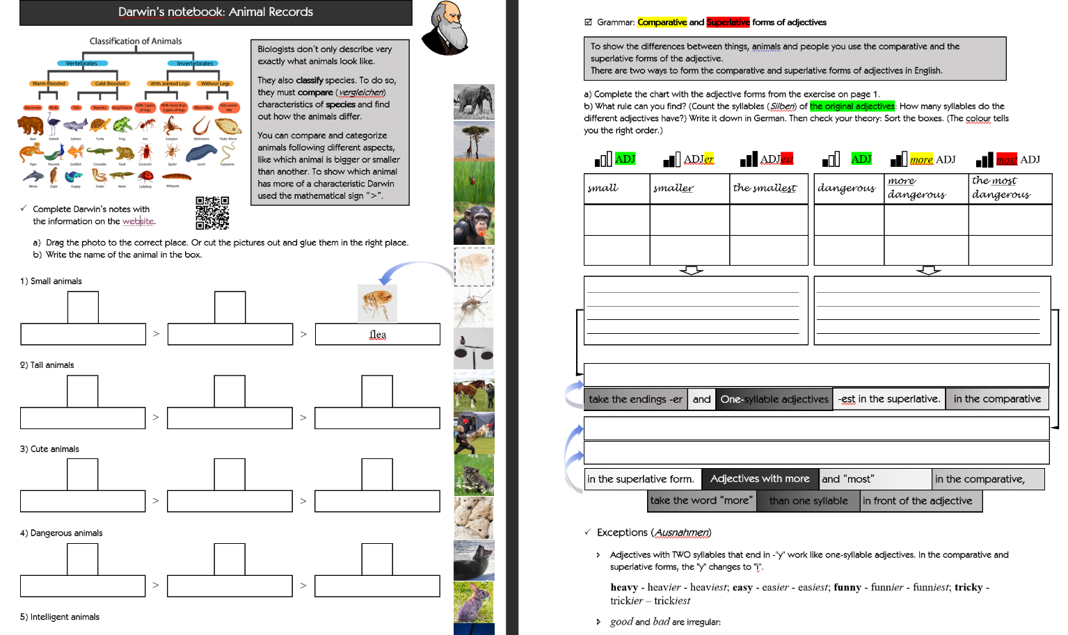 Klasse 6: Steigerung von Adjektiven Ebenfalls aus der Lockdown-Periode stammt diese mit Adobe Spark erstellte Seite "Darwin's Notebook", um induktiv die Steigerung der Adjektive einzuführen. Die Schüler nutzten die Texte und Bilder, um damit ein Arbeitsblatt auszufüllen und sich so der grammatischen Regel spielerisch und durch ganz konkretes Handeln (Basteln) zu nähern.