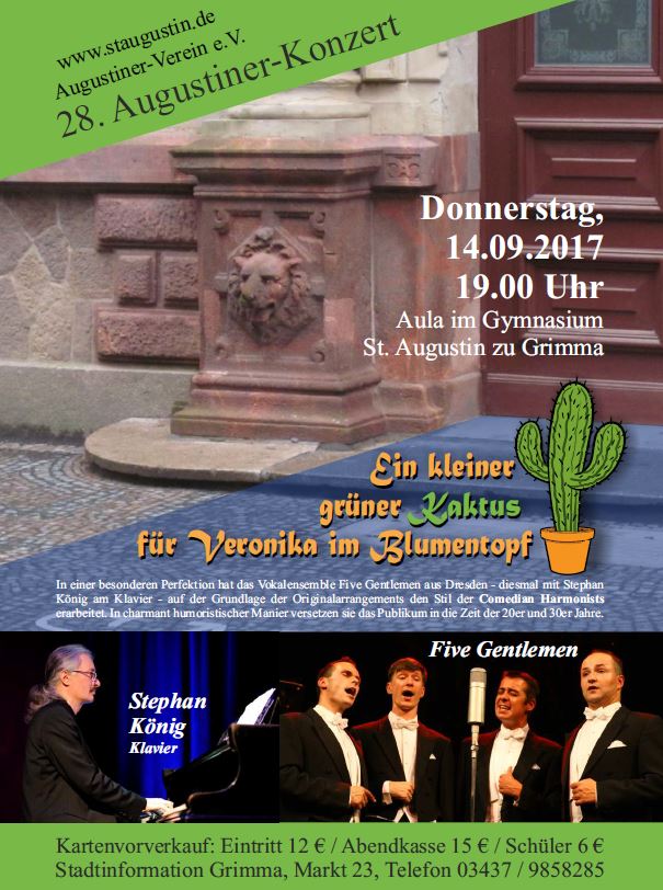 28. Augustiner-Konzert14.09.2017, 19 Uhr, Aula Gymnasium St. Augustin „Ein kleiner grüner Kaktus für Veronika im Blumentopf“Five Gentlemen & Stephan König, Klavier In einer besonderen Perfektion hat das Vokalensemble Five Gentlemen aus Dresden (Michael Schaffrath, Matthias Mehnert, Tobias Leißner und Andreas Konrath, diesmal mit Stephan König am Klavier) auf der Grundlage der Originalarrangements den Stil der Comedian Harmonists erarbeitet – in charmant humoristischer Manier versetzen sie das Publikum in die Zeit der 20er und 30er Jahre.