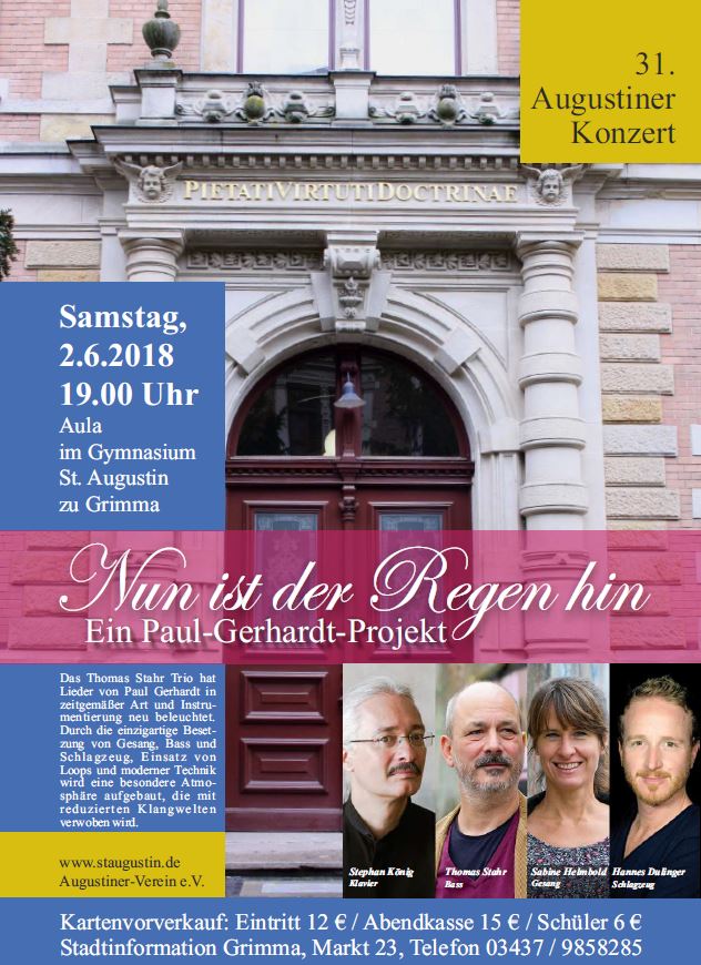 31. Augustiner-Konzert02.06.2018, 19 Uhr, Aula Gymnasium St. Augustin Grimma„Nun ist der Regen hin“ – Ein Paul Gerhardt-ProjektThomas Stahr Trio & Stephan König, KlavierDas Thomas Stahr Trio hat Lieder von Paul Gerhardt in zeitgemäßer Art und Instrumentierung neu beleuchtet. Die auch nach Jahrhunderten heute noch sehr lebendigen und Hoffnung spendenden Texte und Melodien sind eine inspirierende Basis, um mit den Stilmitteln des Latin, Pop und Jazz eine Weltmusik entstehen zu lassen. Durch die einzigartige Besetzung von Gesang, Bass und Schlagzeug, den Einsatz von Loops und moderner Technik wird eine besondere Atmosphäre aufgebaut, die mit reduzierten Klangwelten verwoben wird. Das Interesse ist immer darauf gerichtet, das Wort Paul Gerhardts (der 1622-27 die Fürstenschule St. Augustin Grimma besuchte) im Mittelpunkt der Musik erstrahlen zu lassen. Sabine Helmbold (Gesang), Thomas Stahr (Bass), Hannes Dullinger (Schlagzeug), Stephan König (Klavier)