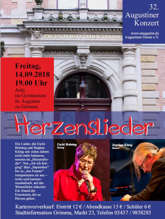 32. Augustiner-Konzert14.09.2018, 19 Uhr, Aula Gymnasium St. Augustin Grimma„Herzenslieder“Uschi Brüning (Gesang) und Stephan König (Klavier)Die Lieder, die Uschi Brüning und Stephan König seit vielen Jahren nicht mehr loslassen, nennen sie „Herzenslieder“. Von „Als ich fortging“ über „September“ bis zu „Am Fenster“ (das sie 2017 als Duo-Version für den MDR aufgenommen haben) interpretieren sie neu – intim und kammermusikalisch, auf das Wesentliche reduziert. Ein Abend der Emotionen, die zu Herzen gehen. Die ostdeutsche Grande Dame des Jazz - über die unvergleichliche Uschi Brüning wurde schon alles gesagt, am eindrucksvollsten ließ es Ulrich Plenzdorf einst seinen Romanheld in "Die neuen Leiden des jungen W." formulieren: "Wenn die Frau anfing, ging ich immer kaputt" , schrieb er, "Ich glaube, sie ist nicht schlechter als Ella Fitzgerald. Sie hätte alles von mir haben können, wenn sie da vorn stand mit ihrer großen Brille und sich langsam in die Truppe einsang." Beim Dresdner Schlagerfestival 1972 gelang Uschi Brüning der Durchbruch. Schon zuvor war die 1947 in Leipzig geborene Sängerin in der Klaus Lenz Big Band als außerordentlich stimm-begabt aufgefallen, später vervollkommnete sie ihren Stil im Günther Fischer Quintett, im European Jazz Ensemble, im Duo mit Ernst-Ludwig Petrowsky und bei gemeinsamen Konzerten (und CDs) mit Manfred Krug. Jazz und Soul steckten von Anfang an in ihren Liedern, "Dein Name", geschrieben von Walter Barthel und Monika Jacobs, hat im Original mit Orgel und Chor die Wucht und Tiefe eines Gospel. Heute wirkt das Lied wie eine emotionale Zeitreise, im Wissen um eine kostbare Erinnerung. (Quelle: Sonntags-Fragen, Jennifer Sonntag, MDR). www.uschibruening.de Stephan König wurde 1963 in Berlin geboren. Er studierte nach dem Besuch der Spezialschule für Musik Halle/S. an der Hochschule für Musik Leipzig die Hauptfächer Klavier, Komposition und Dirigieren und ist seither freischaffend tätig. Neben seiner Unterrichtstätigkeit an der Leipziger Hochschule für Musik und Theater hat er diverse Gastverträge bei namhaften Orchestern und Bühnen und wirkte bei zahlreichen CD- Rundfunk- und Fernseh-Produktionen mit. Konzertreisen führten ihn nach Asien, Mittelamerika, Südamerika und durch viele Länder Europas. Auftrags-Kompositionen schrieb er für das Gewandhaus Leipzig, Oper Leipzig, Akademisches Orchester Leipzig, den MDR u.a.. Er arbeitete zusammen mit Georg Christoph Biller, Uschi Brüning, Richard Galliano, Kathrin Göring, Nigel Kennedy, Ines Agnes Krautwurst, Jochen Kupfer, Lyambiko, Ulrike Mayer, Tobias Morgenstern, Martin Petzold, Florian Poser, Fermín Villanueva, Sebastian Weber, Angelika Weiz, Pascal von Wroblewsky, Wolfgang Krause Zwieback, Leipziger Streichquartett, Reinhold Quartett, ensemble amarcord u.v.a. Seit 1998 leitet er das von ihm gegründete "LeipJAZZig-Orkester" und seit 2007 das Kammerorchester 'artentfaltung'.